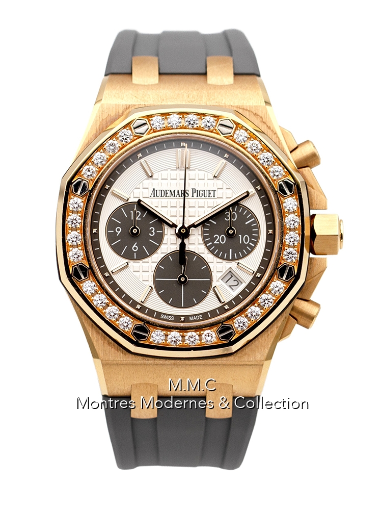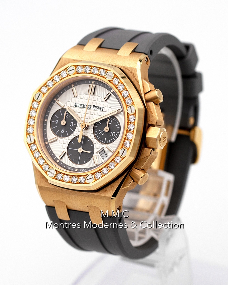 37mm en or rose, lunette sertie de diamants, cadran avec index bâtons luminescents, verre saphir, fond vissé, étanche à 50m