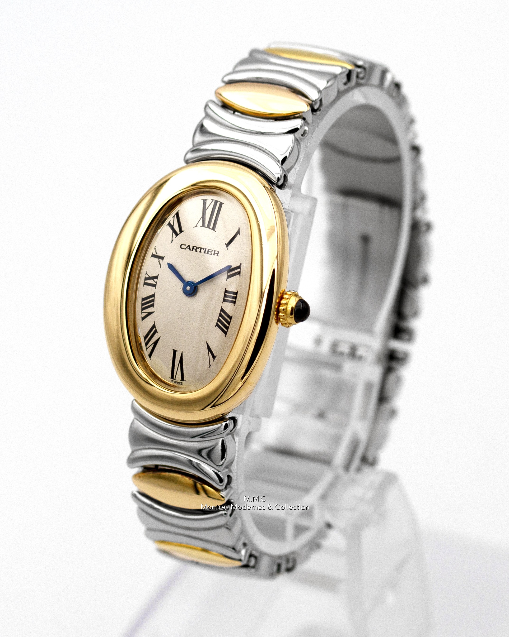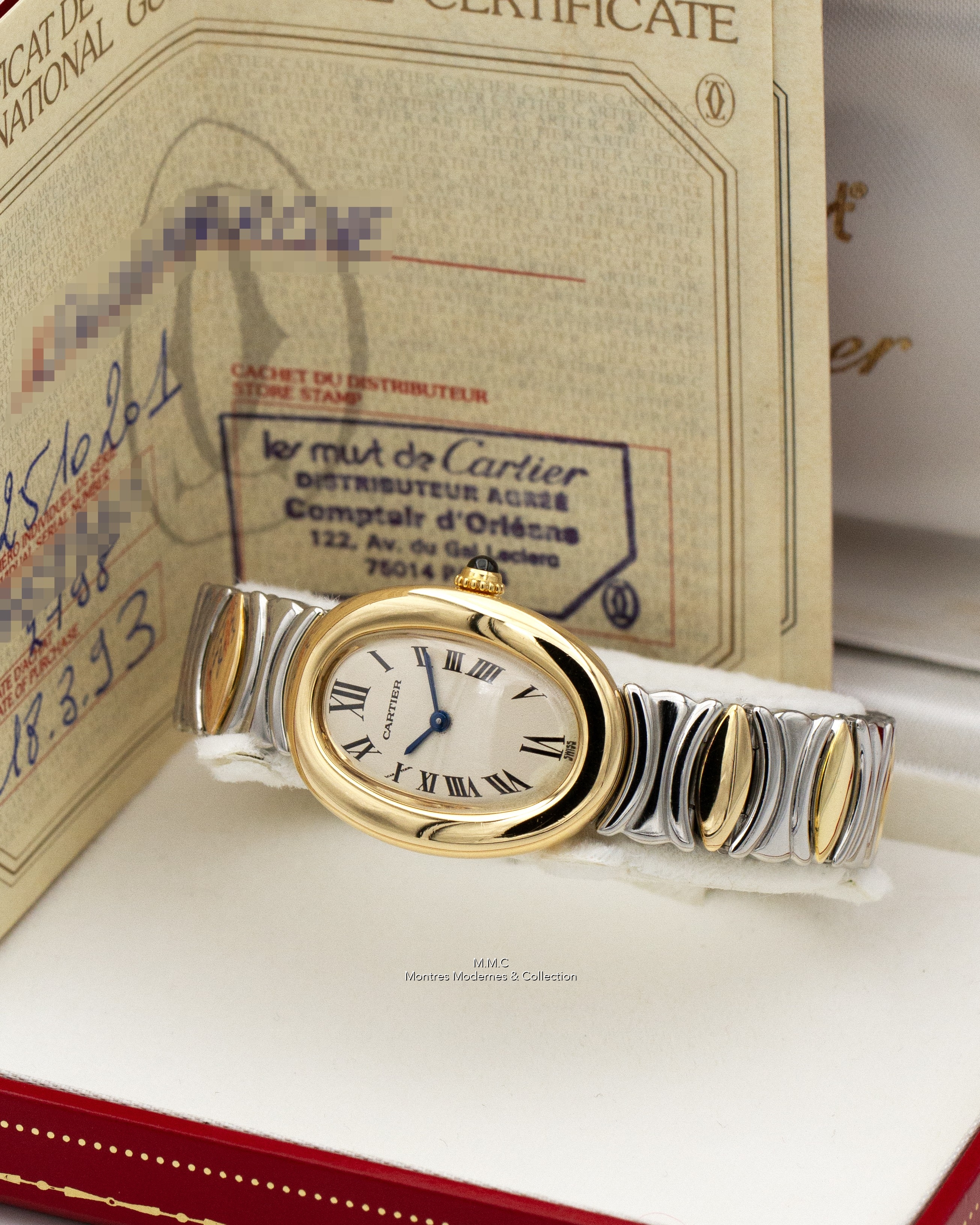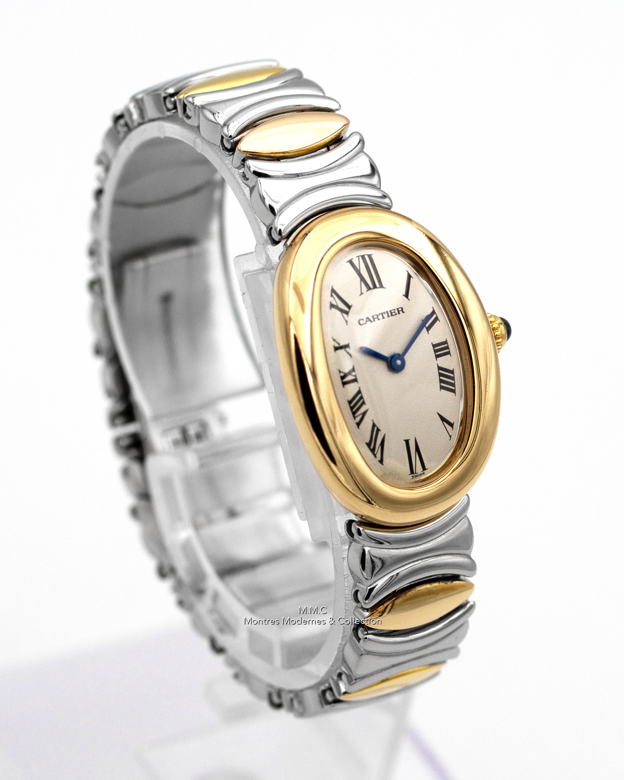 32mm en or jaune, cadran crème avec chiffres romains, verre saphir, fond vissé, couronne ornée d'un cabochon saphir, étanche à 10m