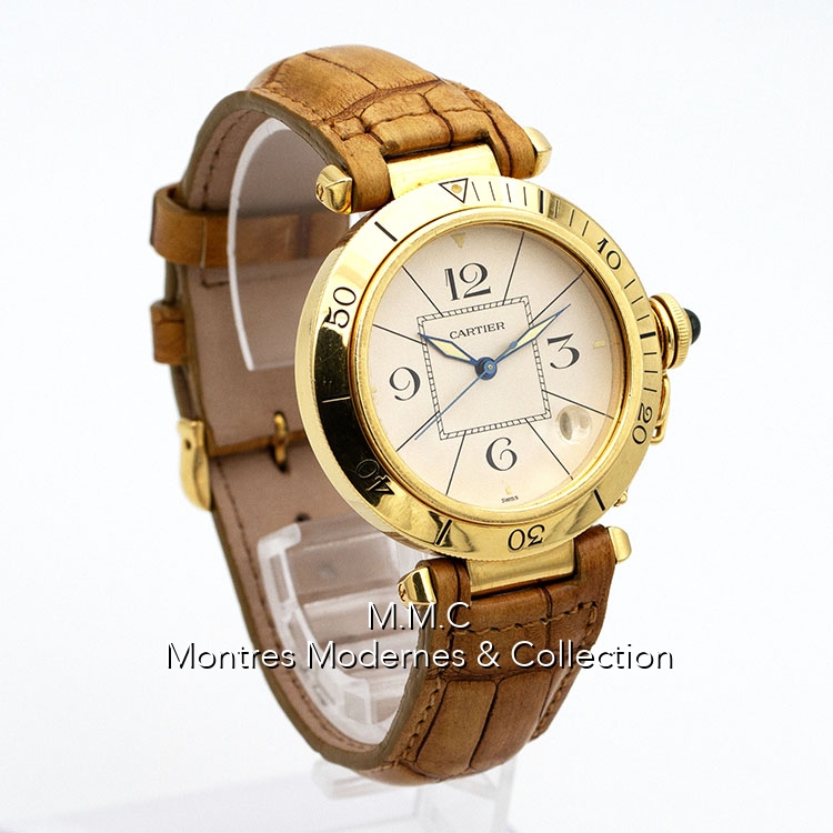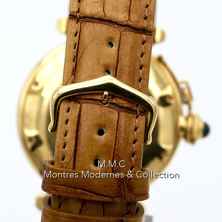 38mm en or jaune, verre saphir, fond vissé, couronne vissée, étanche à 30m