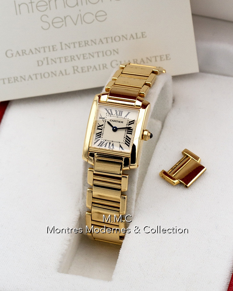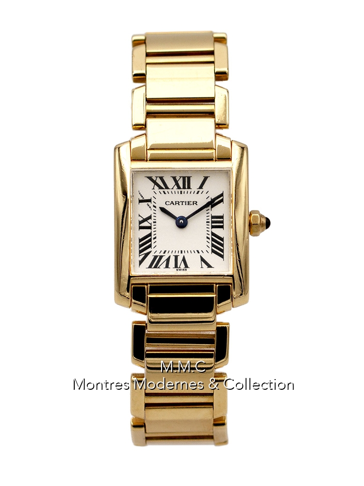 20mm en or jaune, cadran avec chiffres romains, verre saphir, fond vissé, couronne ornée d'un cabochon saphir, étanche à 30m