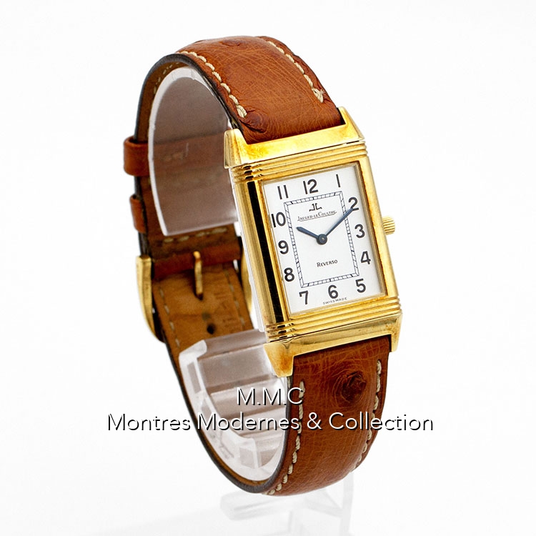 38x23mm en or jaune, boîtier mobile et réversible à 180°, cadran argenté avec chiffres arabes, verre saphir