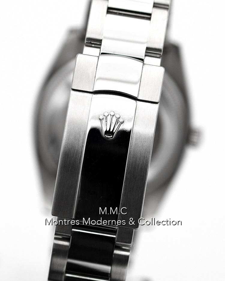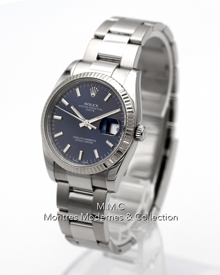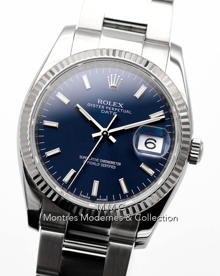34mm en acier, lunette en or gris, cadran bleu avec index bâtons luminescents, verre saphir, fond vissé, couronne vissée, étanche à 100m