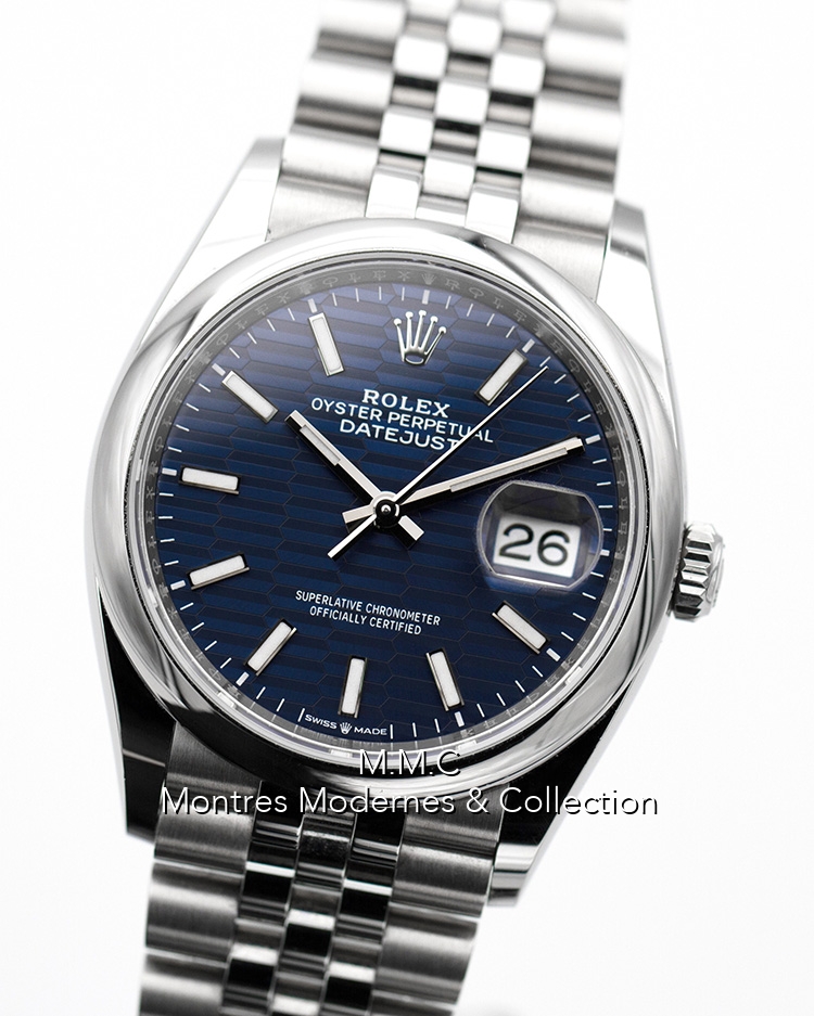 36mm en acier, cadran bleu avec index bâtons luminescents, verre saphir, fond vissé, couronne vissée, étanche à 100m