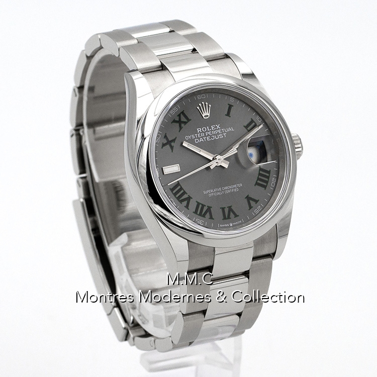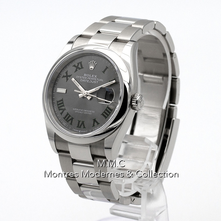 36mm in steel, gray dialwith roman numbers, sapphire glass, screwed backcase, screwed crown, water resistant to 100m