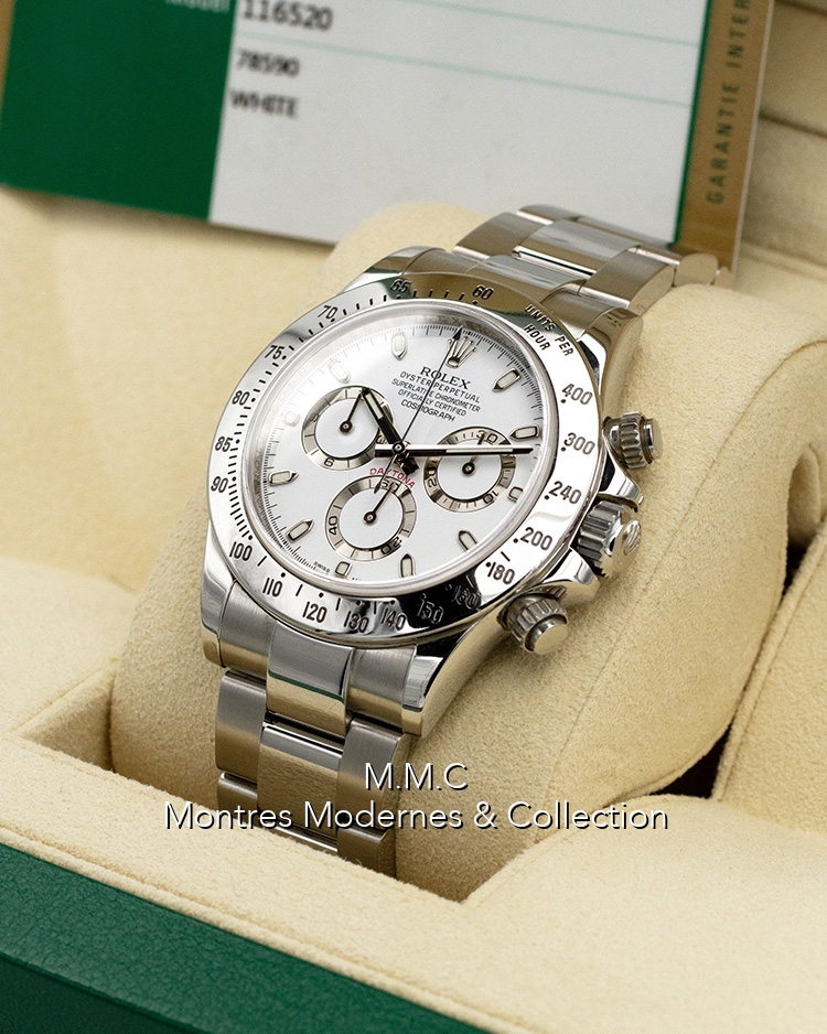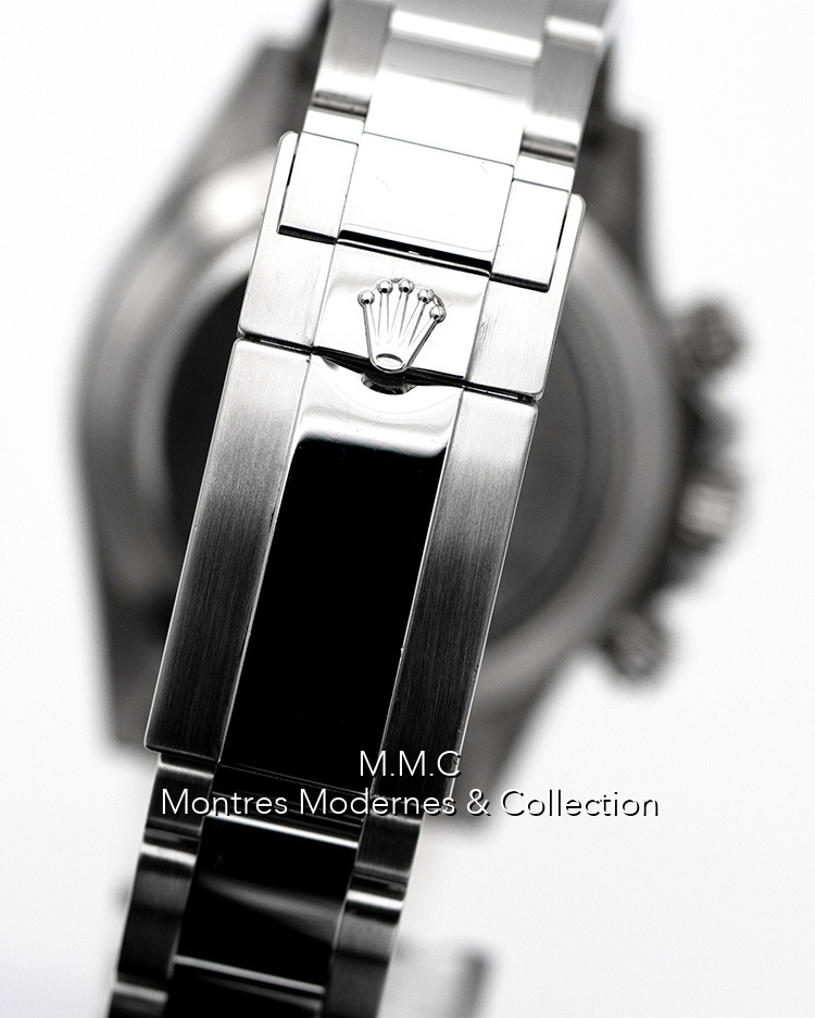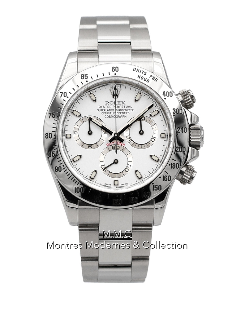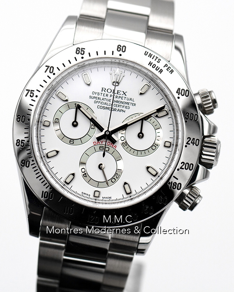 40mm en acier, cadran blanc avec index bâtons luminescents, verre saphir, fond vissé, couronne vissée, poussoirs vissés, étanche à 100m