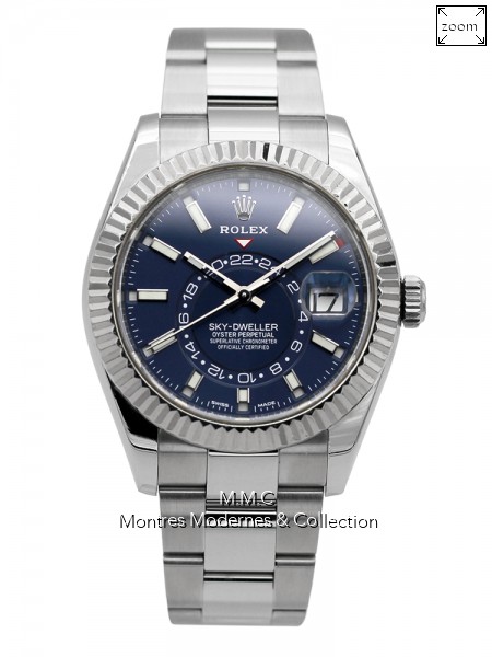 42mm en acier, lunette en or gris, cadran bleu avec index bâtons luminescents, verre saphir, fond vissé, couronne vissée, étanche à 100m |