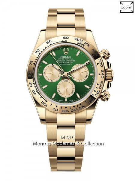 40mm en or jaune, cadran vert avec index bâtons luminescents, verre saphir, fond vissé, couronne vissée, poussoirs vissés, étanche à 100m |