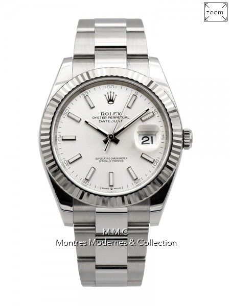 41mm en acier, lunette en or gris, cadran argenté avec index bâtons luminescents, verre saphir, fond vissé, couronne vissée, étanche à 100m |