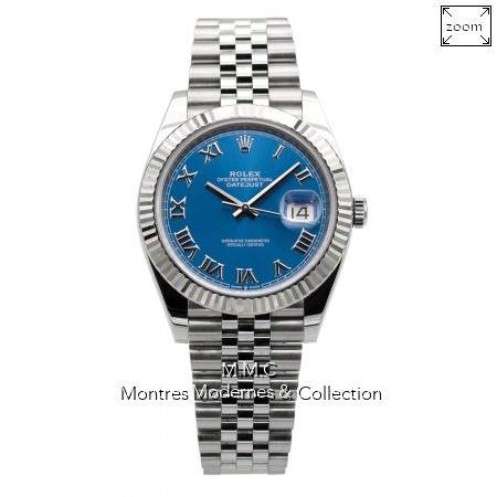 41mm en acier, lunette en or gris, cadran bleu avec chiffres romains, verre saphir, fond vissé, couronne vissée, étanche à 100m |