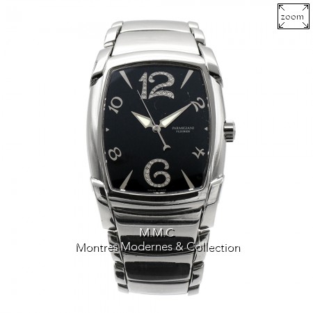 34mm en acier, cadran noir avec index diamants, verre saphir, fond vissé transparent |