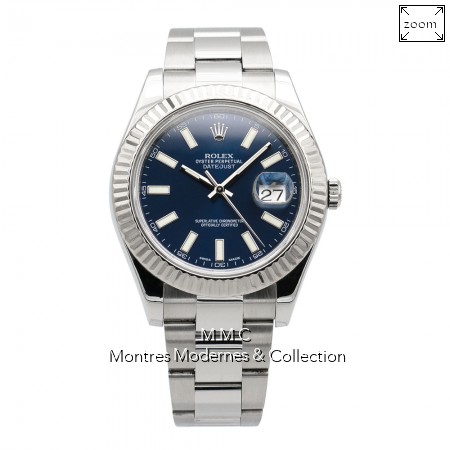 41mm en acier, lunette en or gris, cadran bleu avec index bâtons luminescents, verre saphir, fond vissé, couronne vissée, étanche à 100m |