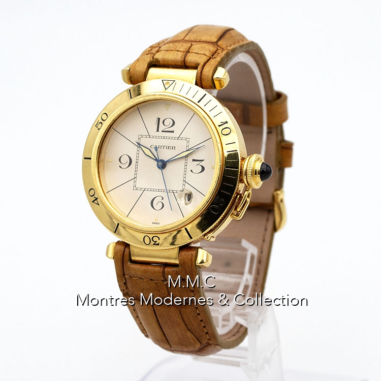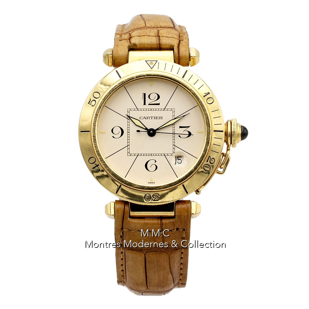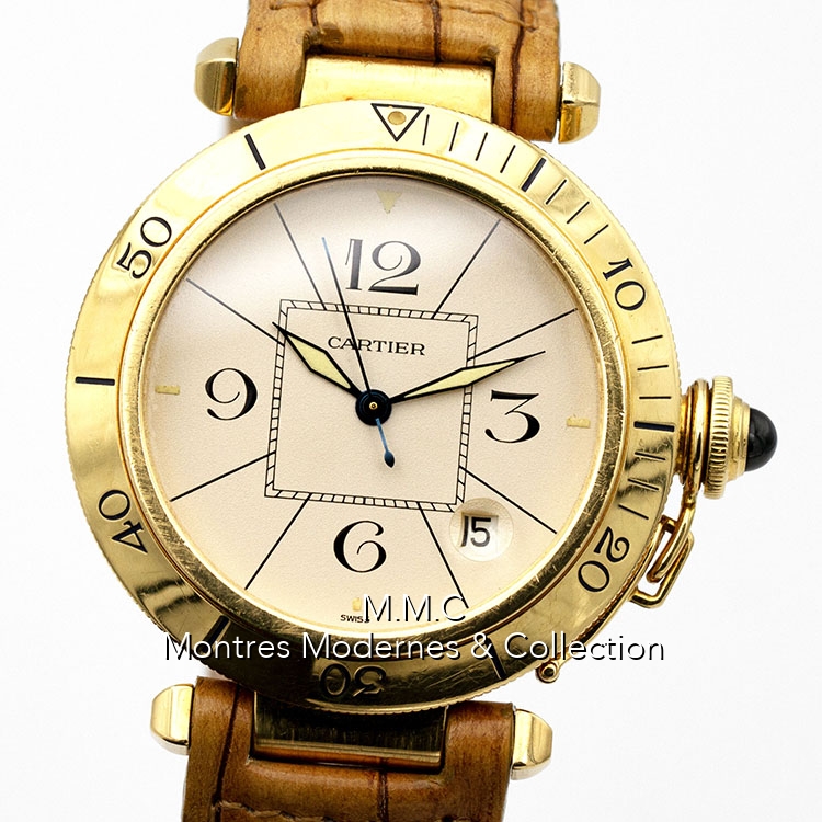 38mm en or jaune, verre saphir, fond vissé, couronne vissée, étanche à 30m