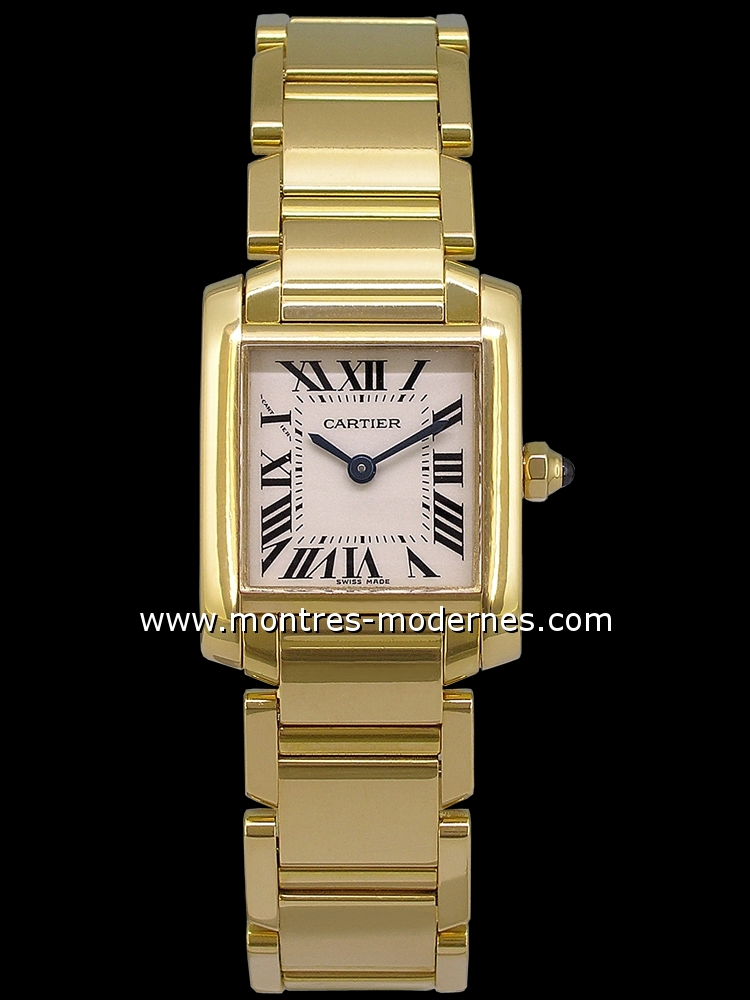 20mm en or jaune, cadran avec chiffres romains, verre saphir, fond vissé, couronne ornée d'un cabochon saphir, étanche à 30m