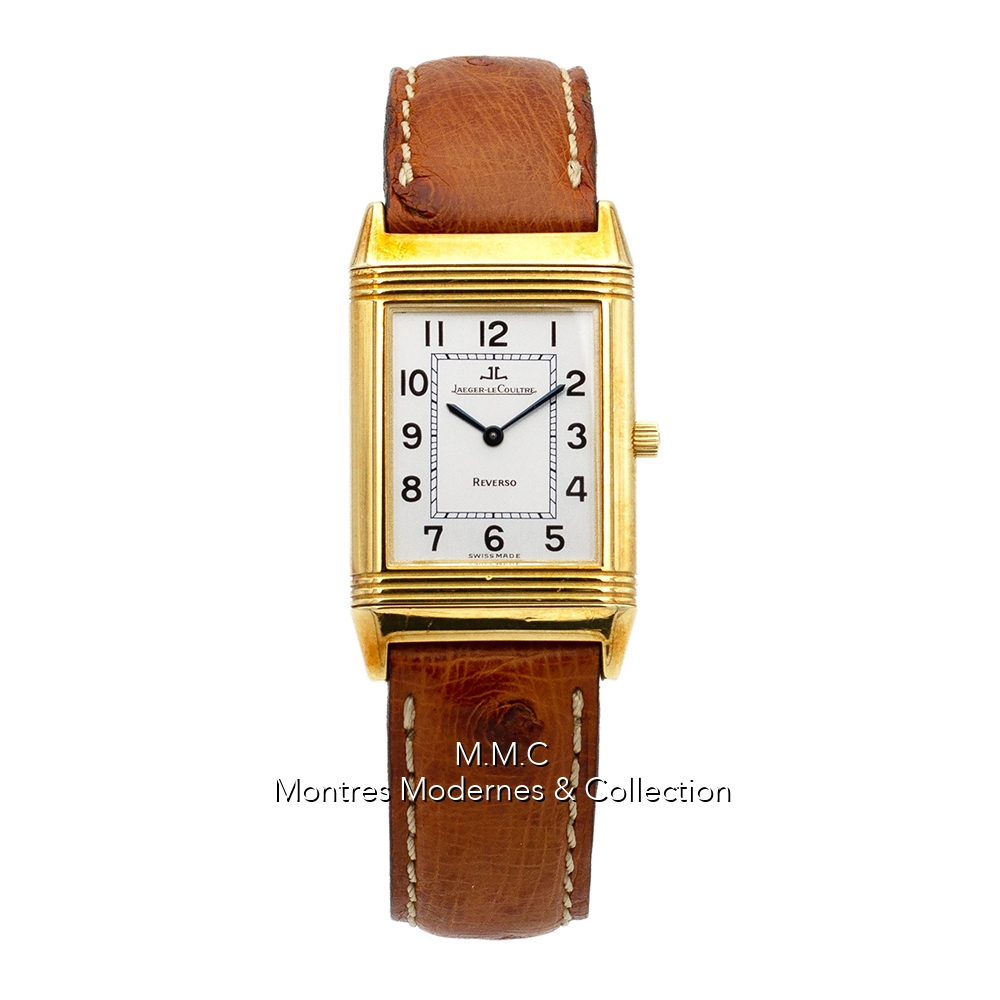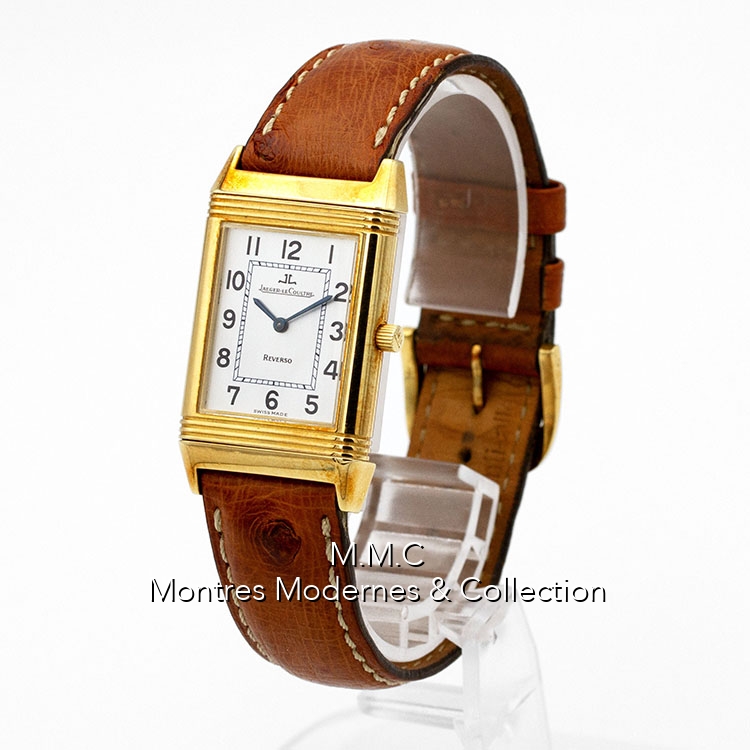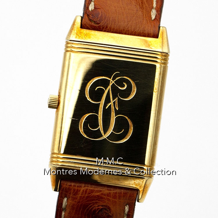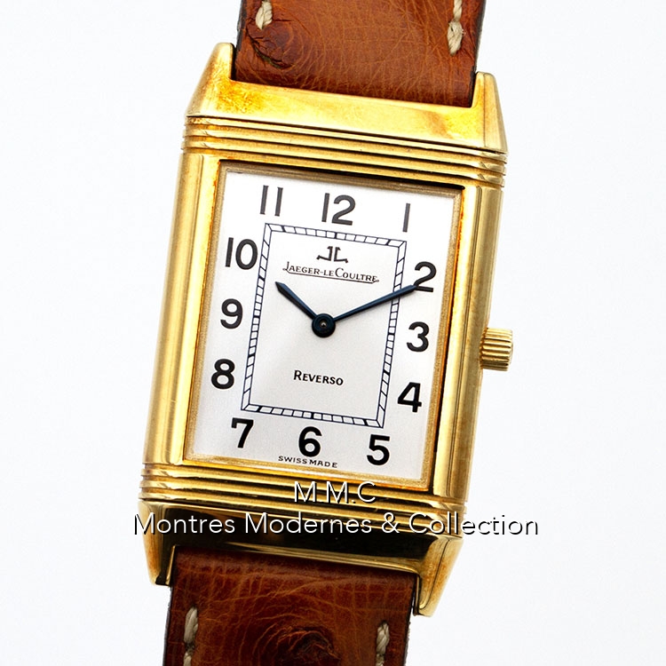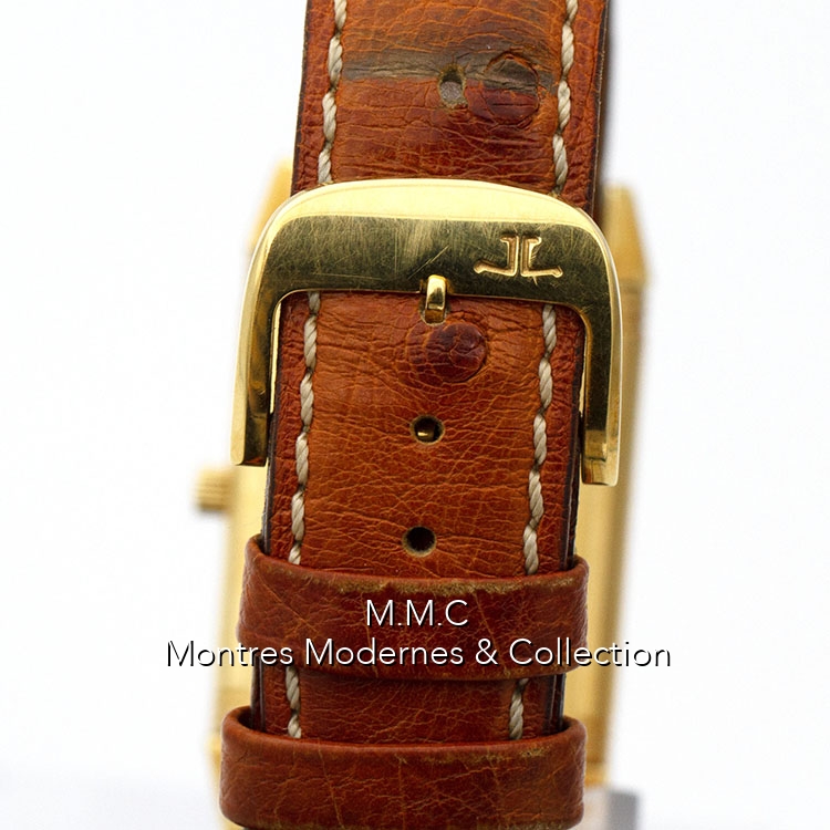 38x23mm en or jaune, boîtier mobile et réversible à 180°, cadran argenté avec chiffres arabes, verre saphir