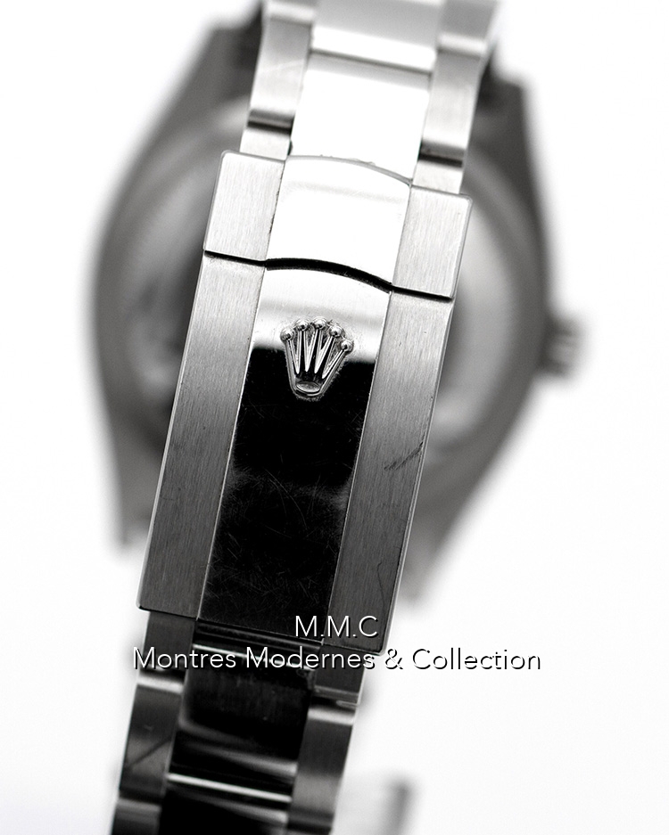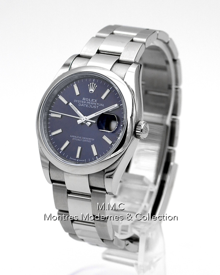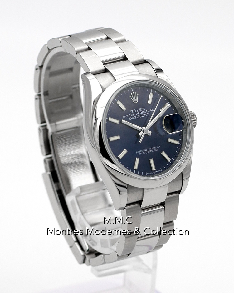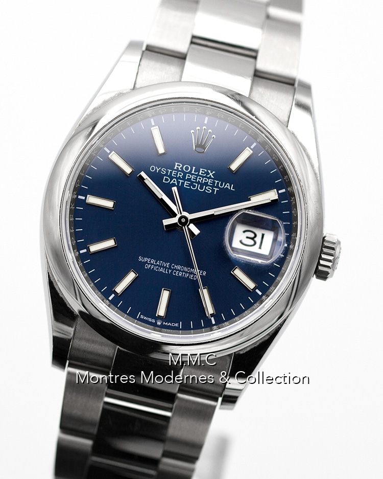 36mm en acier, cadran bleu avec index bâtons luminescents, verre saphir, fond vissé, couronne vissée, étanche à 100m
