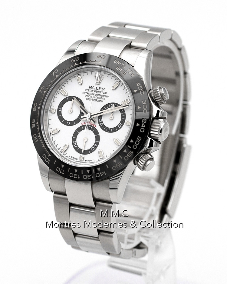 40mm en acier, lunette en céramique, cadran blanc avec index bâtons luminescents, verre saphir, fond vissé, couronne vissée, poussoirs vissés, étanche à 100m