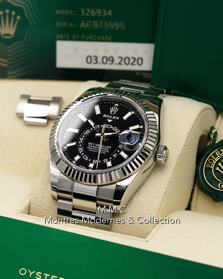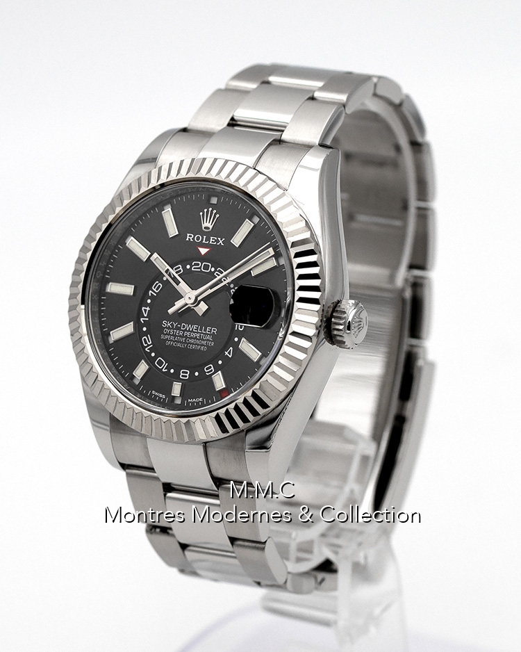 42mm en acier, lunette en or gris, cadran noir avec index bâtons luminescents, verre saphir, fond vissé, couronne vissée, étanche à 100m