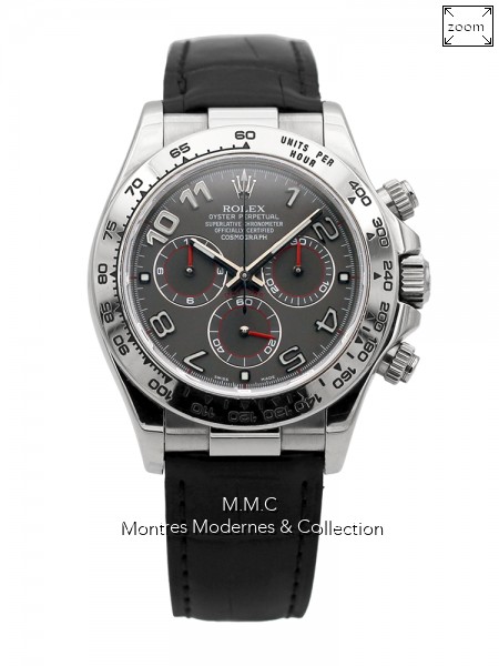 40mm en or gris, cadran gris avec chiffres arabes luminescents, verre saphir, fond vissé, couronne vissée, poussoirs vissés, étanche à 100m |