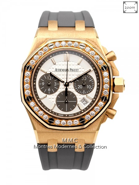 37mm en or rose, lunette sertie de diamants, cadran avec index bâtons luminescents, verre saphir, fond vissé, étanche à 50m |