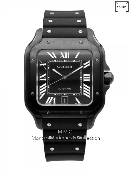 39mm en DLC, lunette fixe en acier, cadran noir avec chiffres romains luminescents, verre saphir, fond vissé, étanche à 100m |