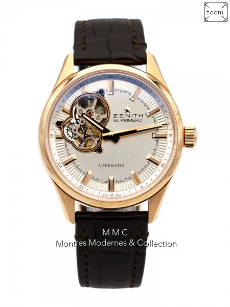 40mm en or rose, lunette fixe en or rose, cadran blanc avec index bâtons, verre saphir, fond vissé transparent, étanche à 100m |