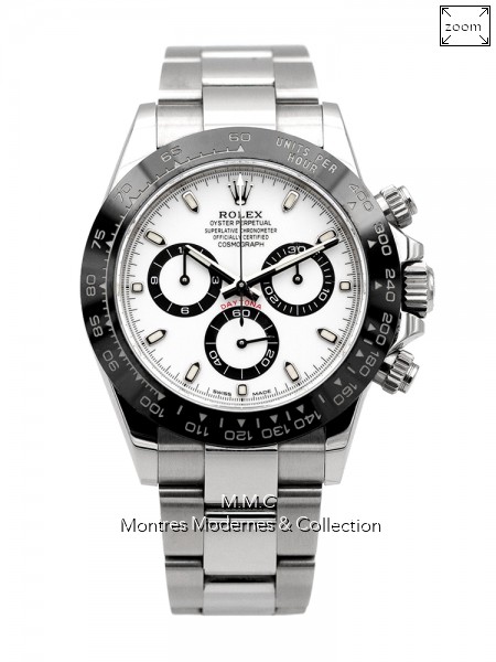 40mm en acier, lunette en céramique, cadran blanc avec index bâtons luminescents, verre saphir, fond vissé, couronne vissée, poussoirs vissés, étanche à 100m |