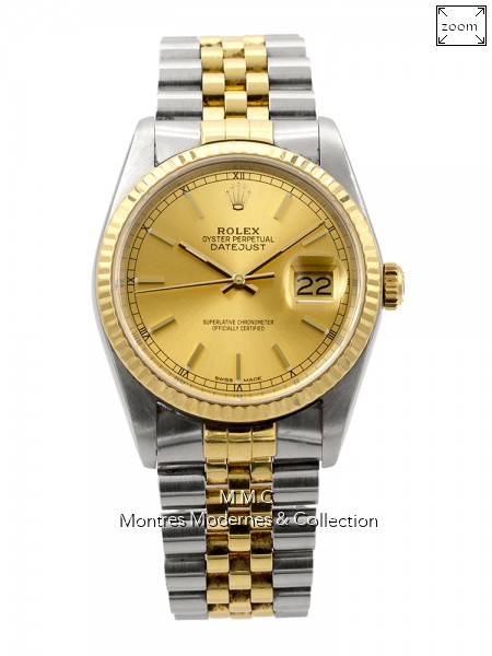 36mm en acier, lunette fixe en or jaune, cadran doré avec index bâtons, verre saphir, fond vissé, couronne vissée, étanche à 100m |