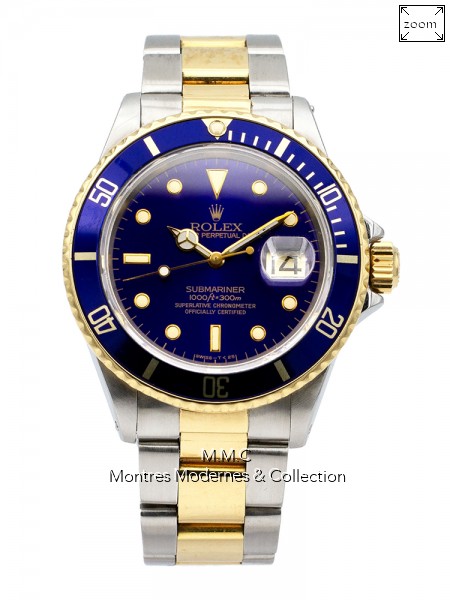 40mm en acier, lunette tournante unidirectionnelle en or jaune, cadran bleu, index et aiguilles luminescents, verre saphir, fond vissé, couronne vissée, étanche à 300m |