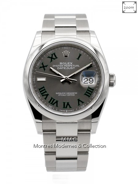 36mm en acier, cadran gris avec chiffres romains, verre saphir, fond vissé, couronne vissée, étanche à 100m |