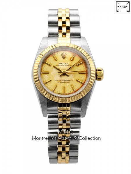 26mm en acier, lunette en or jaune, cadran doré avec index bâtons, verre saphir, fond vissé, couronne vissée, étanche à 100m |