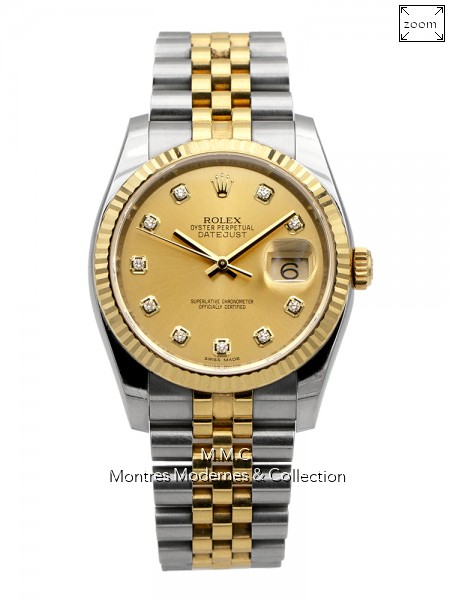 36mm en acier, lunette en or jaune, cadran doré avec index diamants, verre saphir, fond vissé, couronne vissée, étanche à 100m |