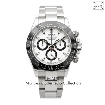 40mm en acier, lunette en céramique, cadran blanc avec index bâtons luminescents, verre saphir, fond vissé, couronne vissée, poussoirs vissés, étanche à 100m |