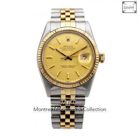 36mm en acier, lunette en or jaune, cadran doré avec index bâtons, verre plexiglas, fond vissé, couronne vissée, étanche à 100m |