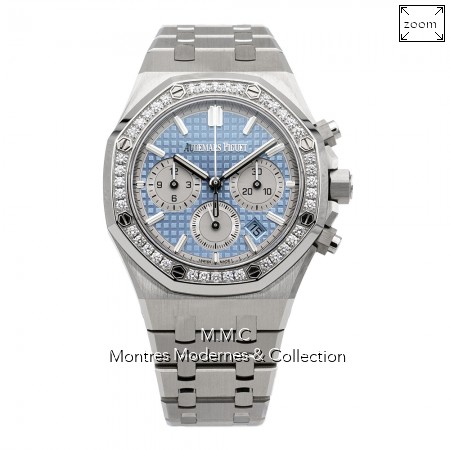 38mm en acier, lunette sertie de diamants, cadran bleu avec index bâtons luminescents, verre saphir, fond vissé, couronne vissée, étanche à 50m |