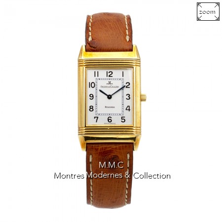 38x23mm en or jaune, boîtier mobile et réversible à 180°, cadran argenté avec chiffres arabes, verre saphir |