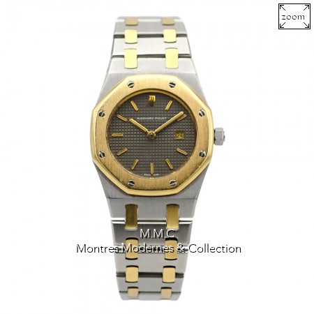 30mm en acier, lunette en or jaune, cadran gris avec index bâtons, verre saphir, fond vissé |