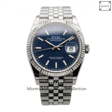 36mm en acier, lunette en or gris, cadran bleu avec index bâtons luminescents, verre saphir, fond vissé, couronne vissée, étanche à 100m |