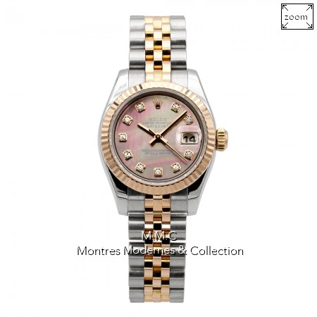 26mm en acier, lunette en or rose, cadran nacre avec index breguet, verre saphir, fond vissé, étanche à 100m |